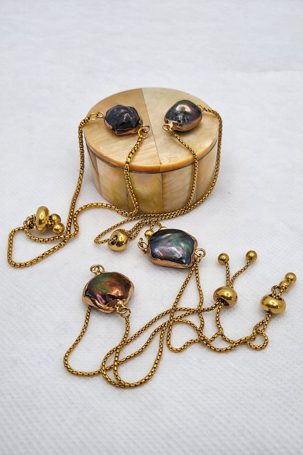 Striking black baroque freshwater pearls set on a sleek gold stainless-steel cable chain bracelet.