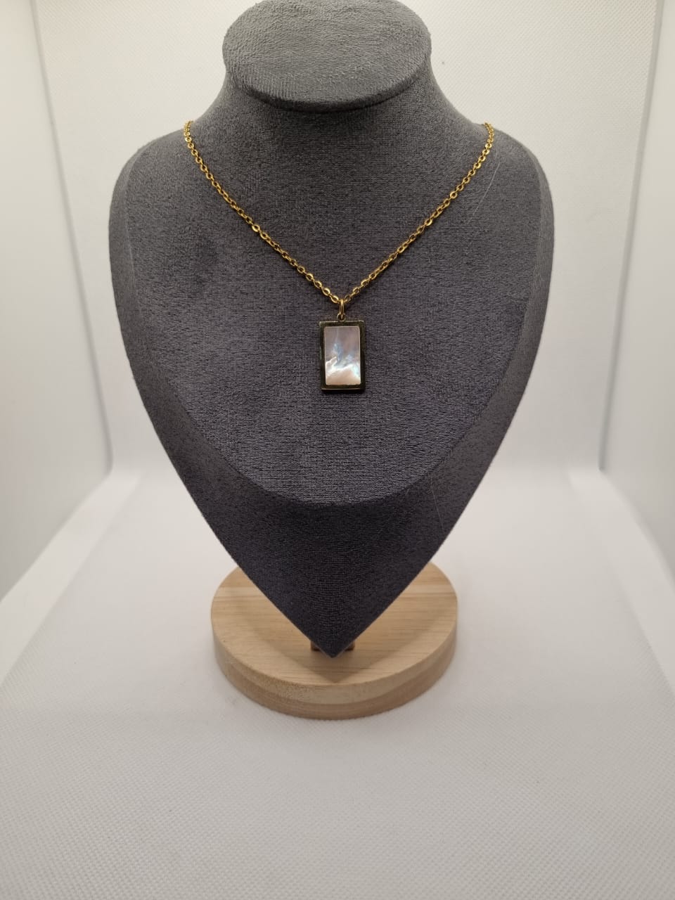 White mother-of-pearl rectangle pendant on a gold stainless-steel chain — classic and versatile.